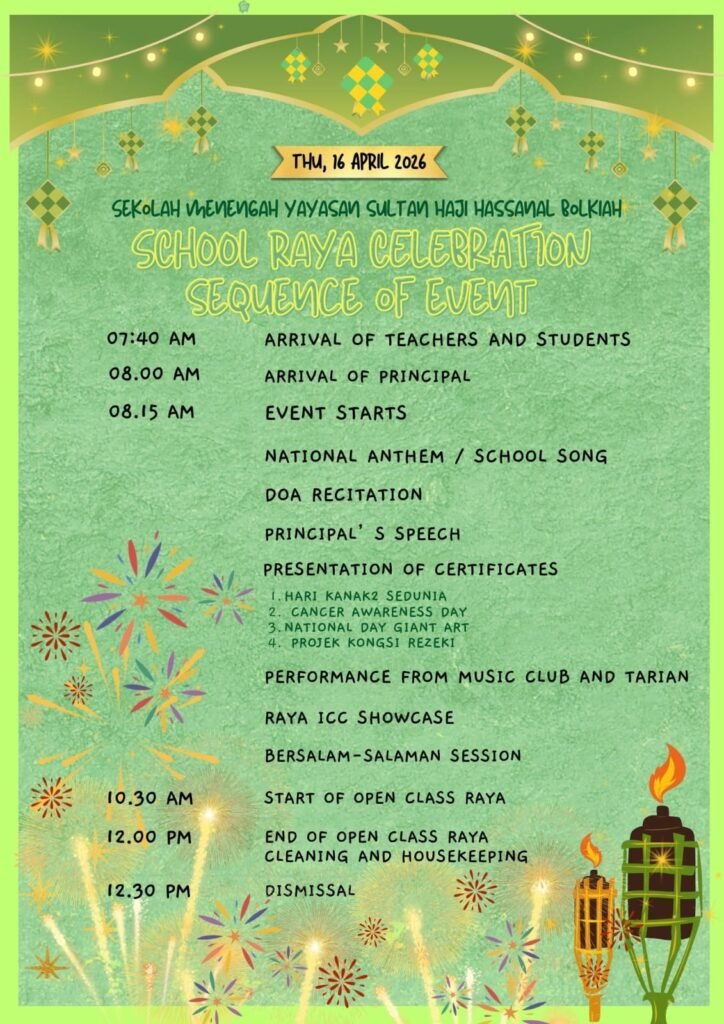 Kindly be informed that Yayasan SHHB Secondary School will be holding a Hari Raya Aidilfitri Celebration 1447H / 2026M as a whole-day event for all students.