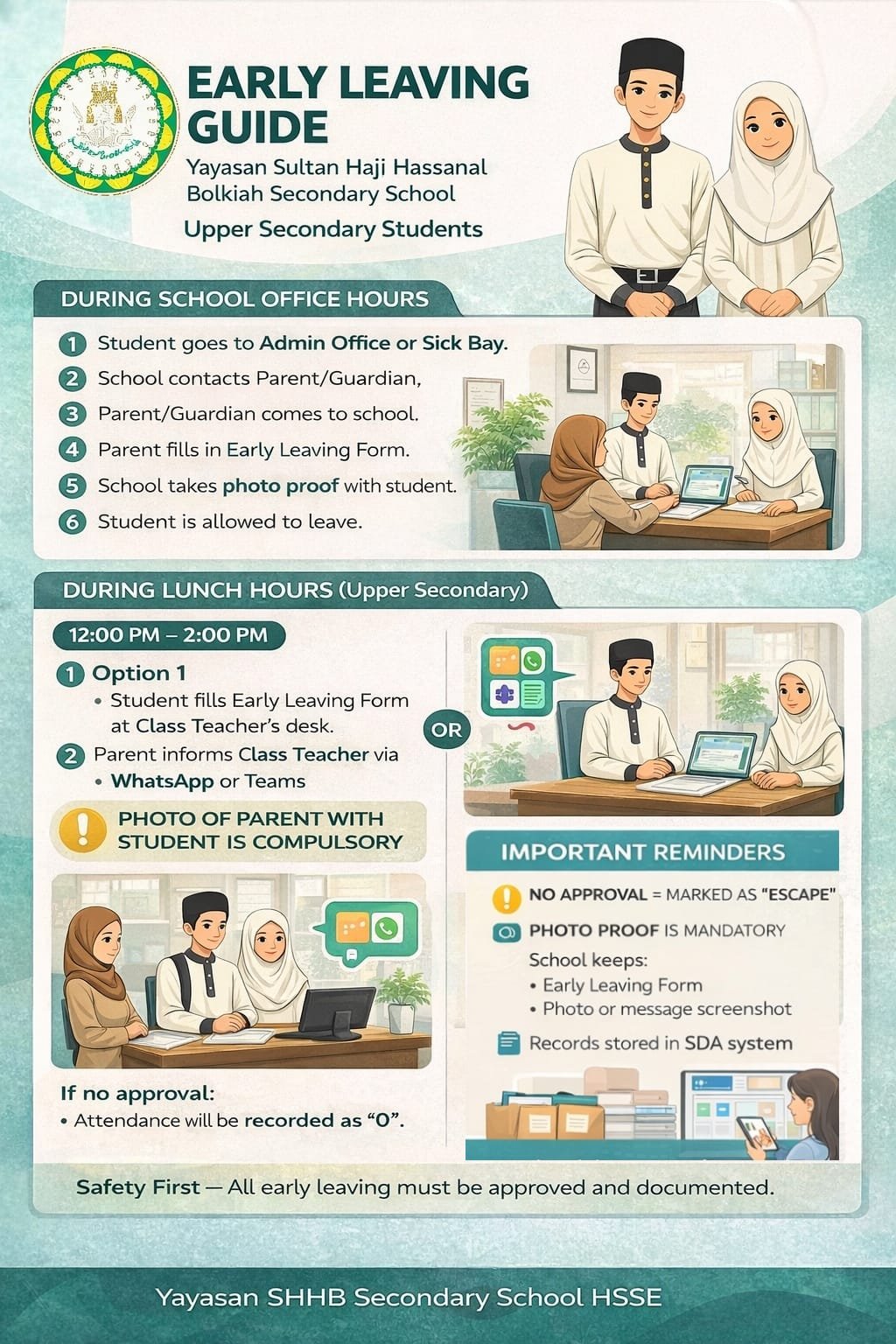 Parents and guardians are kindly requested to carefully read and take note of the Early Leave Flowchart provided. This flowchart outlines the step‑by‑step process, required documentation, and approval procedures to be followed when requesting early leave for a student.
