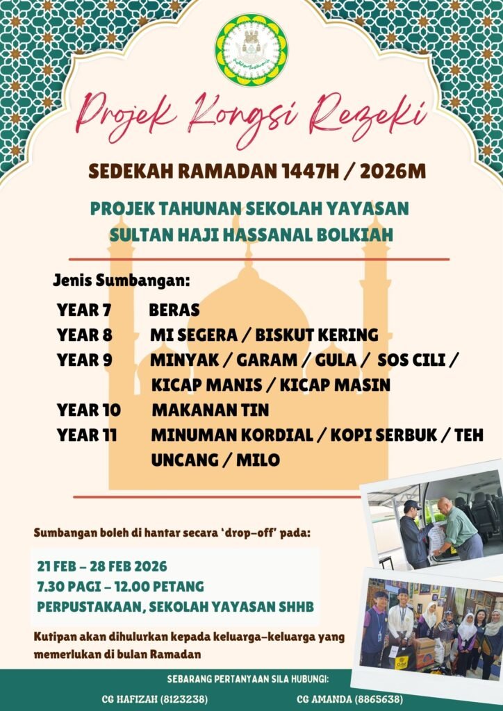Dengan segala hormatnya, merujuk kepada perkara di atas. Sempena kedatangan bulan Ramadan yang penuh keberkatan, Sekolah Menengah Yayasan Sultan Haji Hassanal Bolkiah akan melaksanakan Projek Kongsi Rezeki 2026, iaitu satu program amal tahunan yang bertujuan membantu golongan pesakit yang memerlukan bantuan di bawah Unit Kerja Sosial Perubatan, Hospital RIPAS, Kementerian Kesihatan.