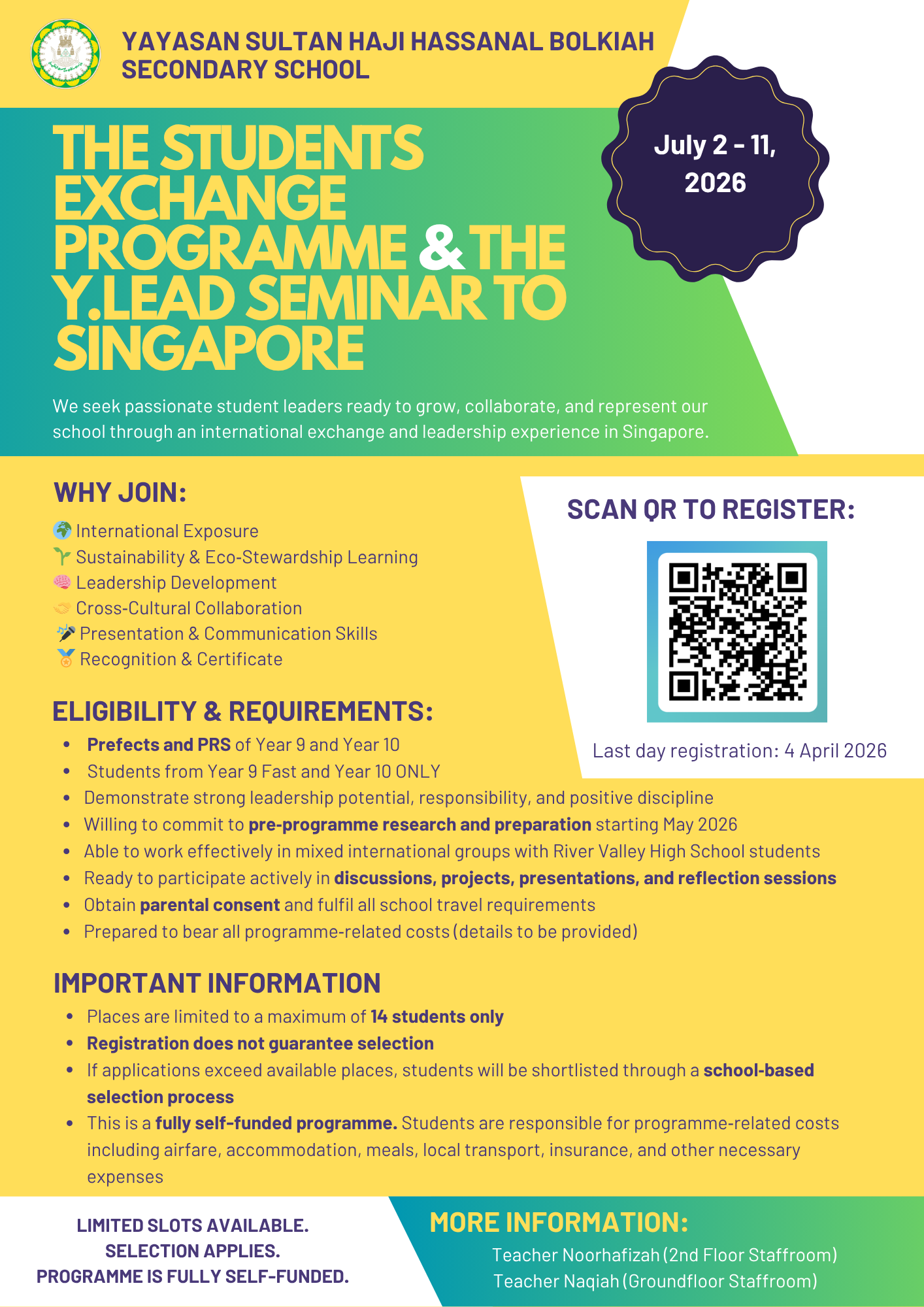 Kindly be informed that YSHHB Secondary School invites Prefects and PRS from Year 9 and Year 10, Year 9 Fast and all Year 10 ONLY to apply for the School Exchange Programme with River Valley High School (RVHS), Singapore, combined with participation in the Y.LEAD Leadership Seminar.