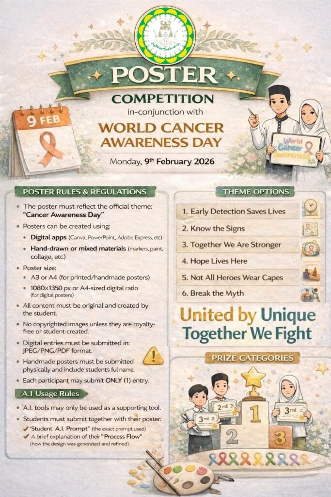 Please also note that the event for the Poster Competition will run simultaneously with the School Isra’ Mikraj Celebration, therefore Subject Teachers will be supervising mobility to and from the event. Normal lessons are held after Breaktime.